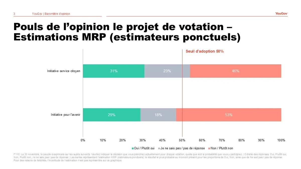 A l’heure actuelle, il manque clairement à chacune des deux initiatives la majorité requise pour être acceptées. Si les votations devaient avoir lieu aujourd’hui, l’initiative service citoyen réunirait ainsi 31 pour cent de voix favorables. S’agissant de l’initiative pour l’avenir, la proportion de «oui» s’élèverait à 29 pour cent.