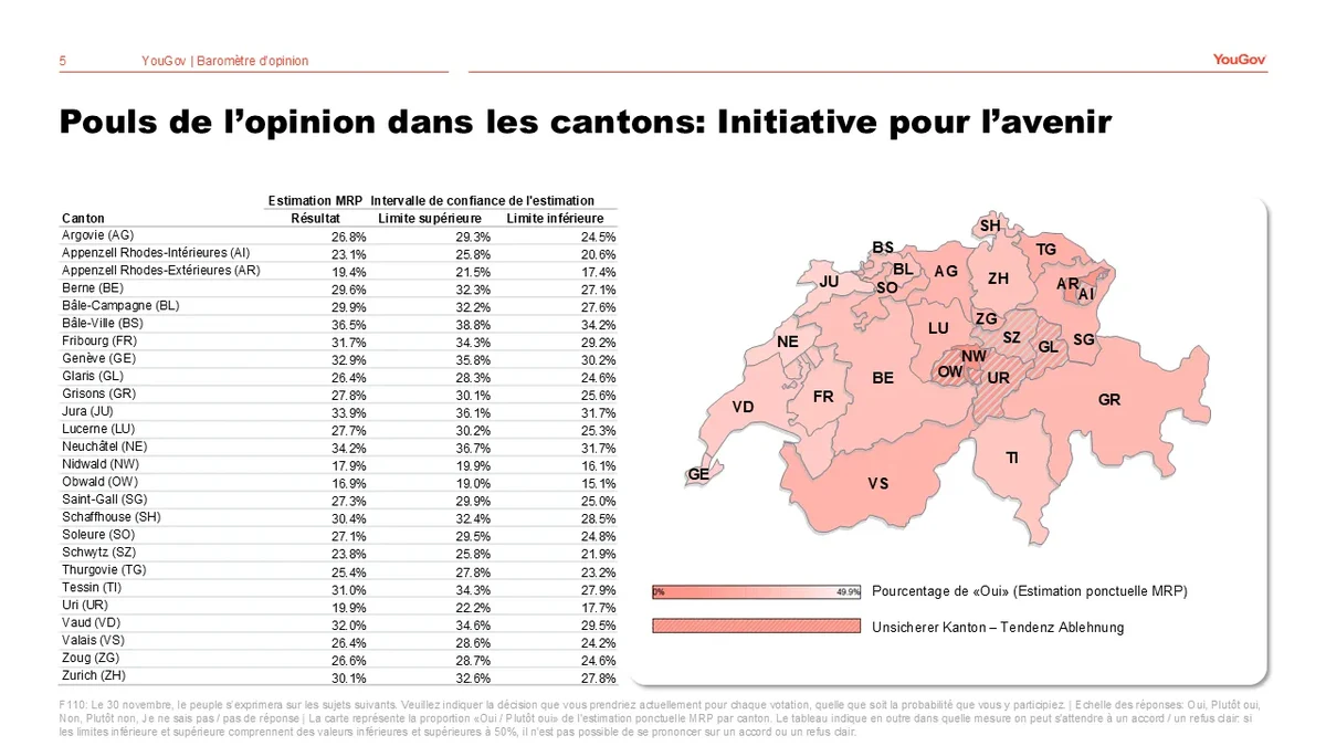 - C’est dans le canton de Bâle-Ville et les cantons romands que l’’initiative pour l’avenir affiche les plus forts taux d’adhésion. Mais là encore, l’actuelle proportion de «oui» reste nettement sous la barre des 50%.