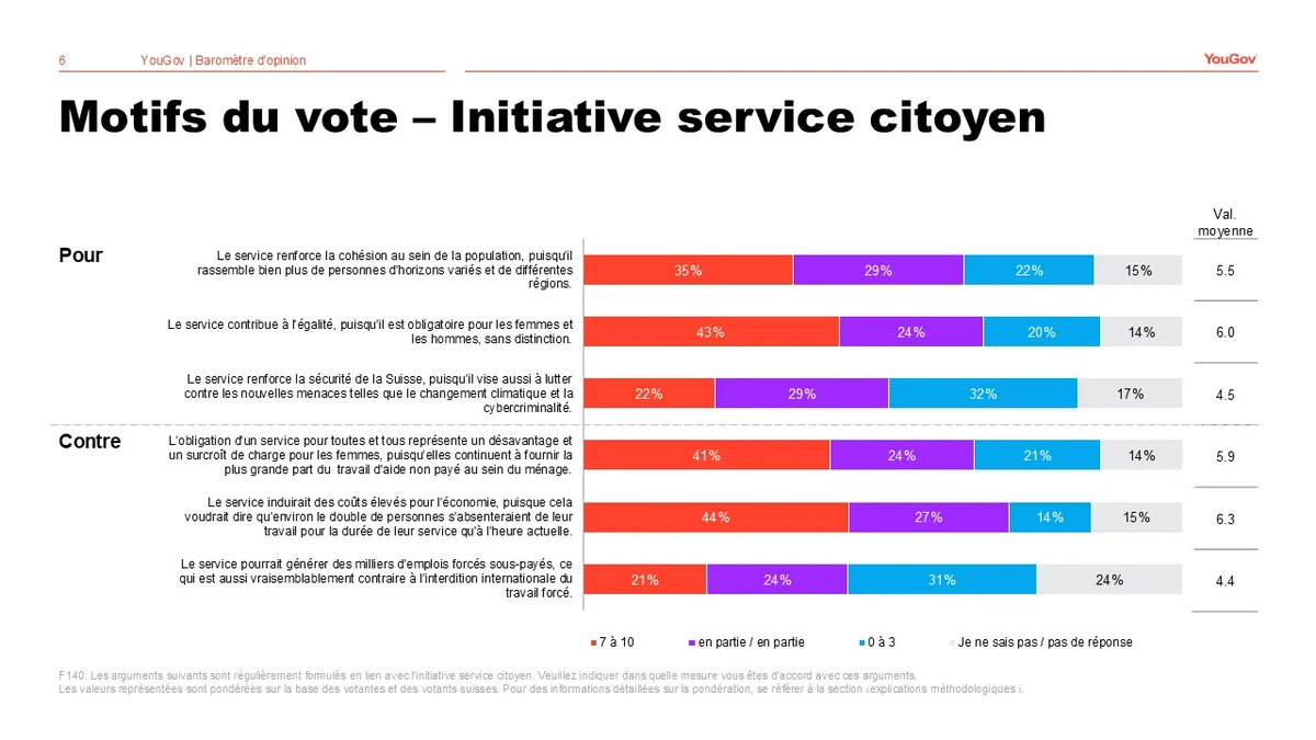 Dans les discussions concernant l’initiative service citoyen, l’argument selon lequel «le service entraînerait des coûts élevés pour l’économie» est celui qui remporte l’adhésion la plus forte, à 44 pour cent (valeurs entre 7 et 10). Sur la question de savoir si le service contribuerait à renforcer l’égalité ou s’il constituerait un surcroît de charge discriminatoire pour les femmes, l’électorat n’a pas un avis clairement tranché. 43 pour cent se dit d’accord avec le premier item, 41 pour cent avec le second. Il est aussi intéressant de noter qu’à cet égard, plus d’un quart (29%) de celles et ceux qui indiquent vouloir (plutôt) voter contre l’initiative est malgré tout d’avis que le service contribuerait à renforcer l’égalité entre les hommes et les femmes. A l’inverse, 27 pour cent de celles et ceux qui voteraient (plutôt) «oui» disent que le service obligatoire serait pour les femmes une charge supplémentaire qui les désavantagerait. La thématique de l’égalité entre les sexes émerge donc comme un point controversé clé associé au «service citoyen». Pour autant, le fait qu’il soit perçu comme un pas vers une plus grande égalité homme-femme ou comme un désavantage pour les femmes n’est pas systématiquement lié à un vote en faveur, respectivement en défaveur de l’initiative.