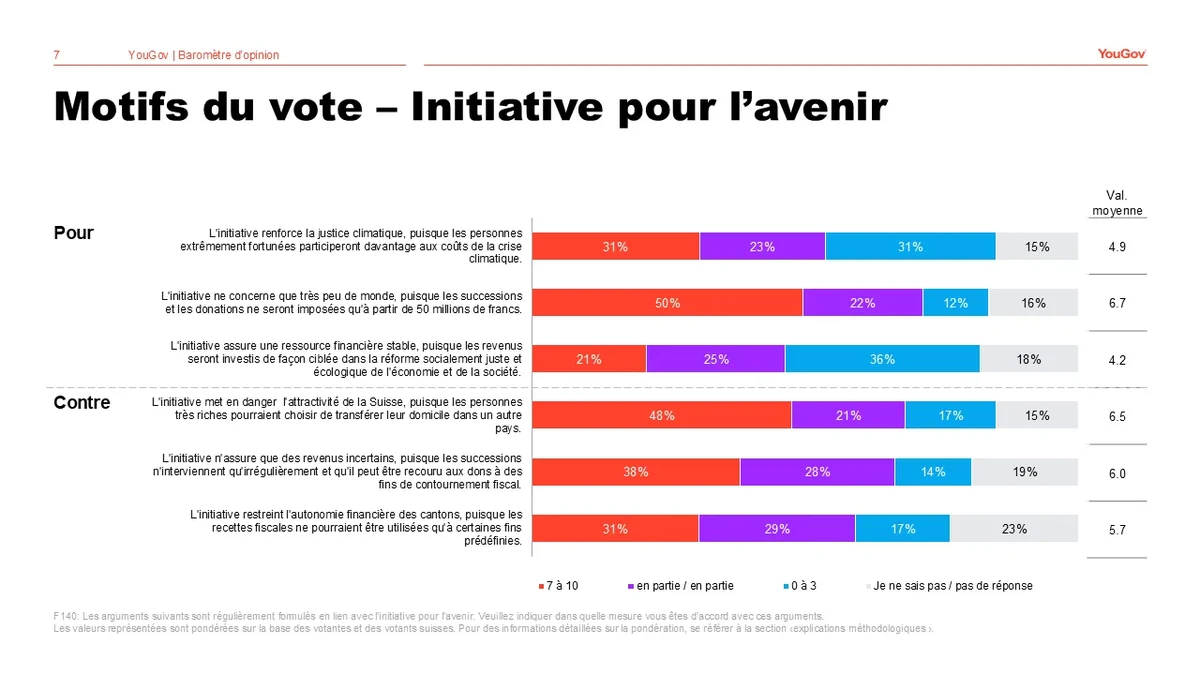Concernant les discussions relatives à l’initiative pour l’avenir, l’affirmation selon laquelle elle «ne concerne qu’une toute petite minorité, puisque l’impôt ne serait prélevé que sur les successions et les dons supérieurs à 50 millions de francs» remporte, à 50%, l’adhésion la plus large. Dans le même temps, elle ne constitue toutefois ni un argument clairement pour, ni un argument clairement contre l’objet concerné, puisque 64 pour cent des répondant·e·s rapportent vouloir voter (plutôt) oui et que parmi celles et ceux indiquant vouloir voter (plutôt) non, 50 pour cent disent être d’accord avec ce postulat. En revanche, les votantes et les votants qui envisagent de (plutôt) rejeter le projet sont ceux qui, à 72%, adhèrent le plus fortement à l’argument économique selon lequel l’initiative mettrait en danger l’attractivité de la Suisse. Quelque 22 pour cent de celles et ceux qui rapportent vouloir voter (plutôt) oui se disent également d’accord avec cette affirmation. Toutefois, les réticences économiques ne semblent pas être décisives dans le choix de vote positif des soutiens à l’initiative pour l’avenir. En revanche, 70 pour cent d’entre eux sont d’accord avec l’argument selon lequel «l’initiative renforce la justice climatique, en mettant plus largement à contribution les personnes extrêmement riches».